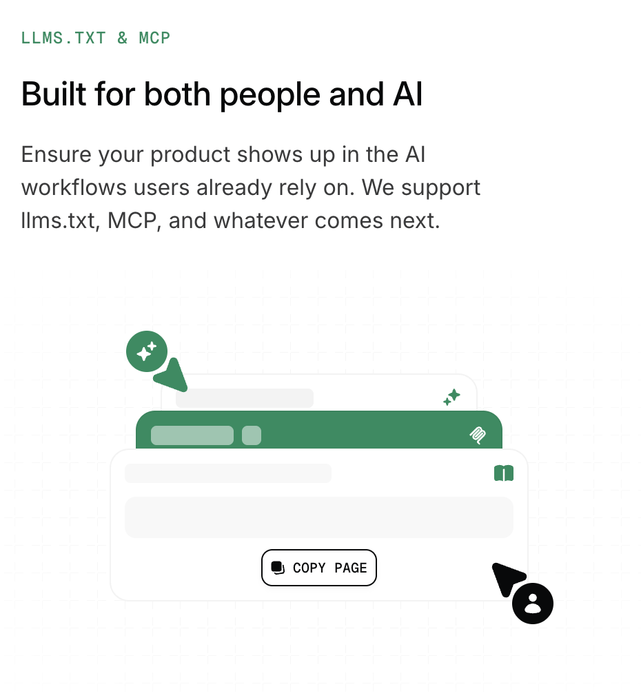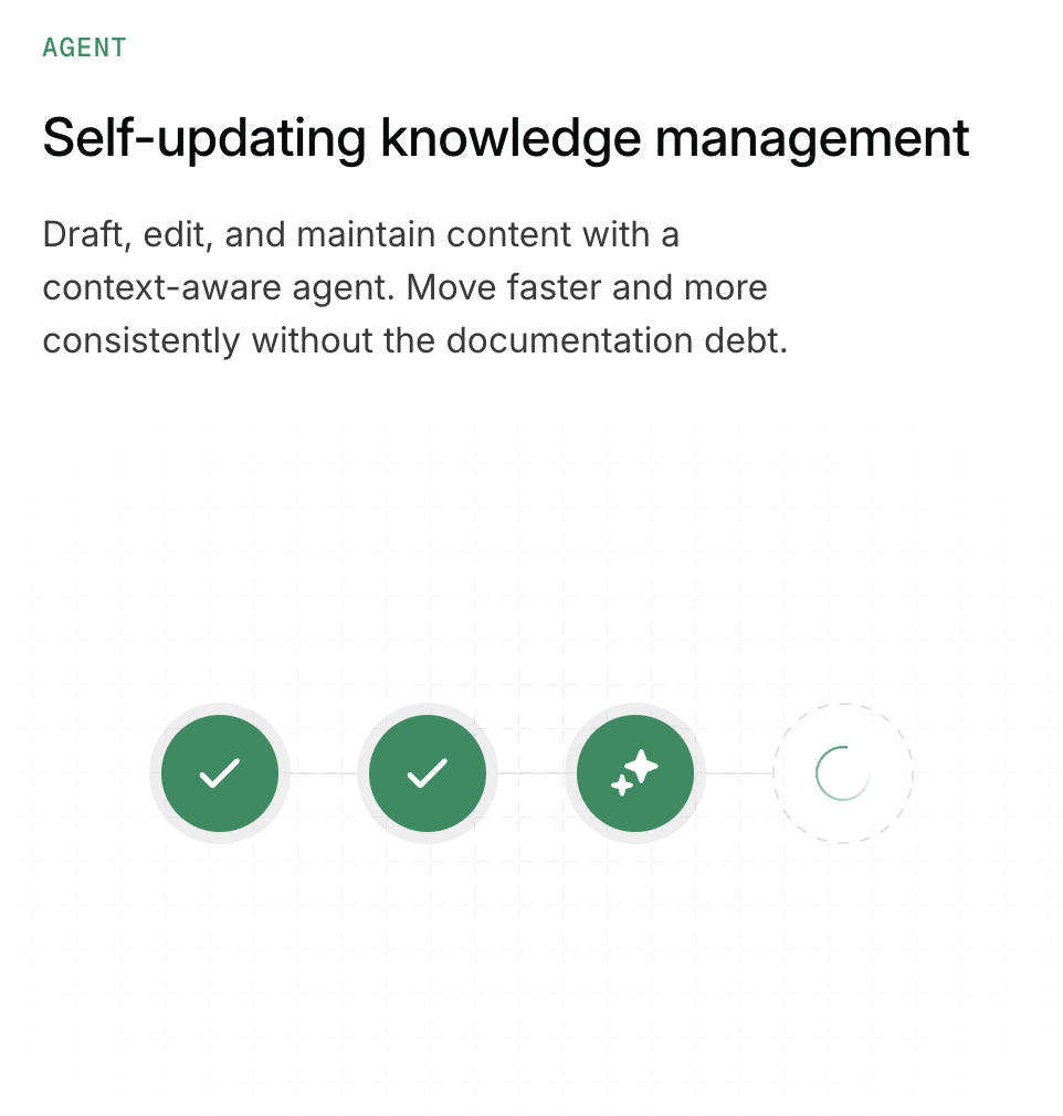 Integrate AI into every part of your docs lifecycle. Woven into how your knowledge is written, maintained, and understood by both users and LLMs.